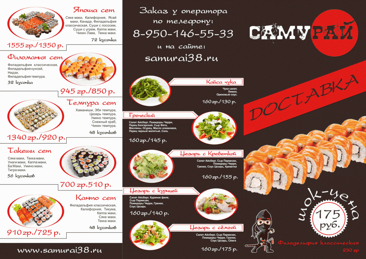 «Самурай» — это современная новая компания, специализирующаяся на приготовлении и доставке блюд японской и европейской кухни в г. Ангарске и Иркутске (скоро открытие). Ассортимент всегда вкусных и больших порций роллов и суши. Мы занимаемся доставкой роллов по г Ангарску, кроме того у нас вы можете заказать суши, салаты и горячие блюда.