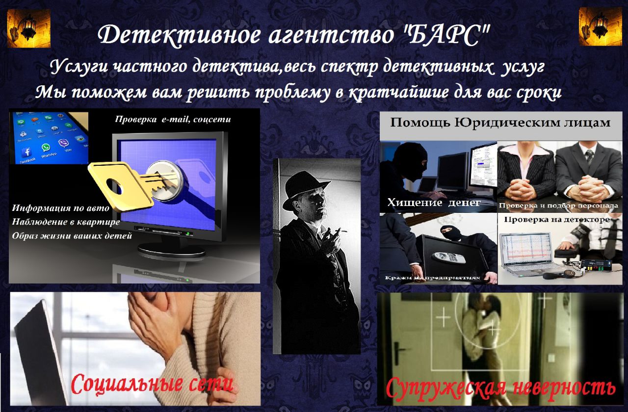Добрый день уважаемые дамы и господа. Я частный детектив и являюсь руководителем детективного агентства «БАРС». Я надеюсь, что мои услуги помогут многим семьям сохранить их брак, надежность и доверие друг к другу а так же избежать разным людям ненужных и сомнительных встреч. Звоните или пишите нам, консультация у нас всегда бесплатно, поможем разобраться в самых запутанных делах. На нашем сайте есть онлайн - консультант, где вы можете оставить свой вопрос детективу. Наши сотрудники своевременно помогут отследить нежелательные контакты ваших вторых половин, образ жизни ваших детей, помочь в розыске без вести пропавшего человека, определить местоположение человека по сотовому оператору, сделать детализацию и распечатку смс сообщений и много другое. Заходите на наш сайт и там вы сможете узнать более подробную информацию о нашем детективном агентстве и услугах. Мы рады будем видеть Вас на нашем сайте. С уважением к Вам Детективное агентство «БАРС» НАШ САЙТ: uslugi-detectiva.ru Группа в контакте https://vk.com/club137493079 Почта: Uslugi-detektiva@yandex.ru WhatsApp, Viber 8-925-720-56-87(писать в ватсап, вайбер и почту можно круглосуточно)