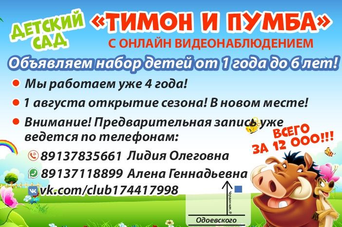 Частный Детский сад «Тимон и Пумба» объявляет набор детей от 1 года до 6 лет! Мы работаем уже 4 года! С 1 августа открытие нового сезона в новом, специально оборудованном по всем требованиям СанПиН, жилом помещении! Наши преимущества: - Квалифицированные педагоги; - Online-видеонаблюдение; - Сенсорная комната; - При заключении договора, страховка на 1 год БЕСПЛАТНО! а также: - Охраняемая территория; - Своя огороженная детская площадка для прогулок; - Пятиразовое питание (с учетом индивидуальных особенностей, таких как аллергия); - Ежедневные занятия по * развитию речи; * развитию мелкой моторики; * развитию навыков самообслуживания ( развиваем навык самостоятельного приёма пищи, приучаем к горшку, отучаем от сосок и бутылочек, учим самостоятельно одеваться и т.д.). Всё это всего за 12000 рублей в месяц! Мы работаем круглосуточно, подробную информацию по пребыванию можно получить по телефонам. Дополнительно: - развивающие занятия по английскому языку; - занятия с логопедом; - подготовка к школе индивидуально; - осмотр педиатром еженедельно; - лечебный и профилактический массаж; - кислородные коктейли, био мороженное, биовестин и т.д. Мы находимся: ул. Червонная, д. 9 Будем рады принять Вашего ребёнка в наш дружный коллектив!